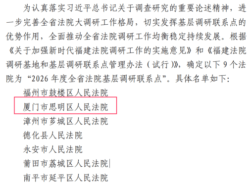 1月30日,青海省委依法治省办调研组一行至海丝中央法务区、厦门金融司法协同中心参观调研。福建省委依法治省办成员、省司法厅党委委员、副厅长黄洪旺,厦门市委依法治市办副主任、市司法局党组书记、局长许俊强陪同调研。调研组一行实地参观中心的智慧服务大厅、金融司法协同研究基地、党建会议室等场所,详细了解中心在职能架构创新、协同机制建设、金融纠纷多元化解、金融风险防控、金融营商环境优化等方面的工作成效,对中心的创新理念和创新成果给予了高度赞扬。
